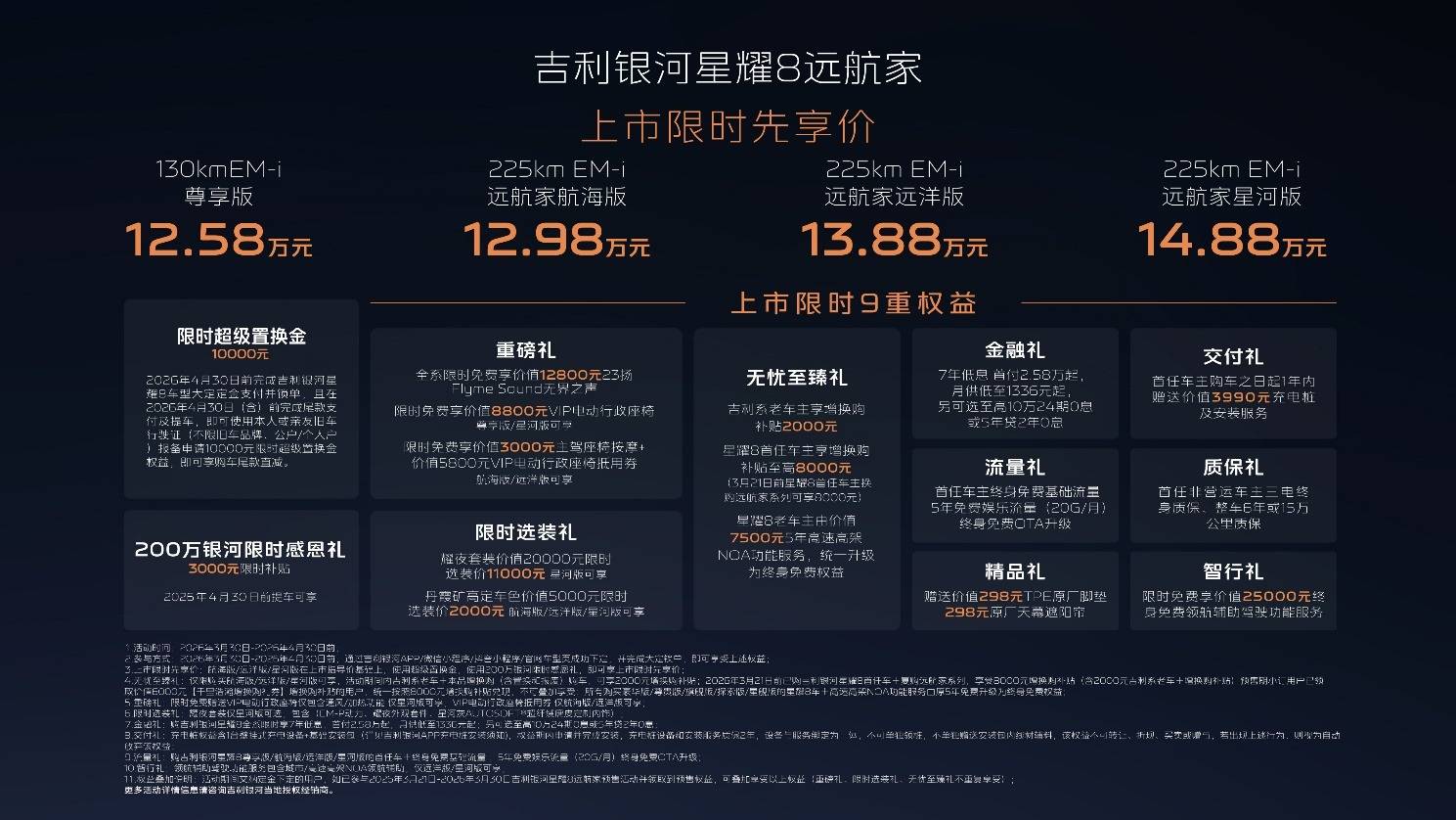 当然,新车上市的福利也很真实,9重购车权益直接拉满:10000元限时超级置换金,全系免费享价值12800元的23扬声器音响和8800元的VIP电动行政座椅,首任车主还有终身免费根底流量、5年免费文娱流量,乃至还送充电设备和装置服务,金融礼更是做到了首付2.58万起、月供1336元起,吉祥老车主还有额定的增换购补助。
